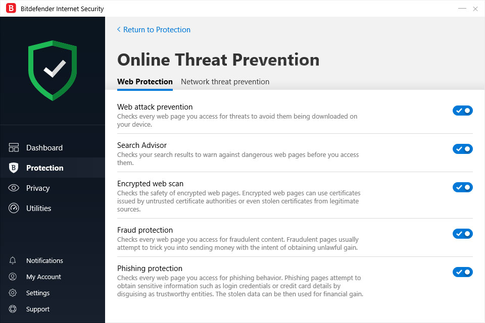 يوفّر البرنامج حماية كاملة ضد الفيروسات، برامج التجسس، سرقة الهوية، برامج الفدية، محاولات الاختراق، ومختلف أنواع البرمجيات الخبيثة، مع مجموعة كبيرة من أدوات الخصوصية والتحكم.
